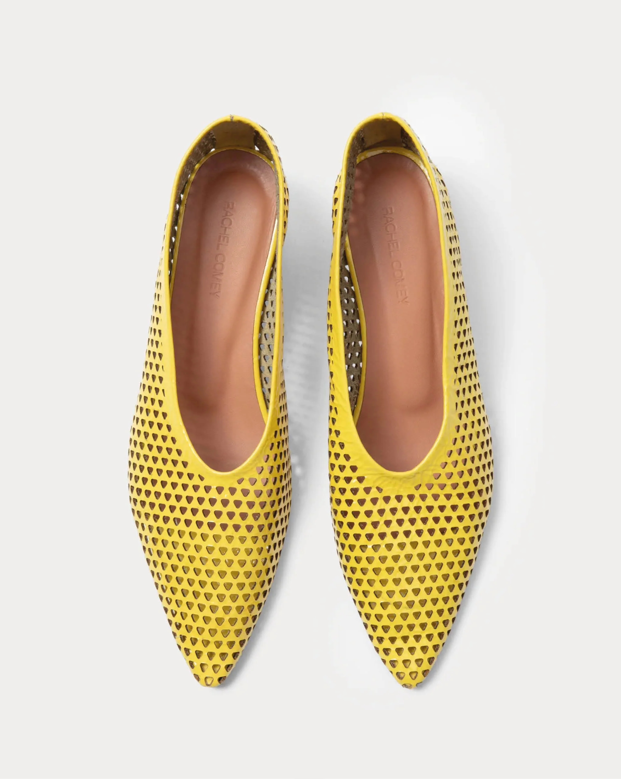 Rachel Comey pointed-toe kitten heel with a perforated triangular design on crinkle patent leather. Heel height 35 mm