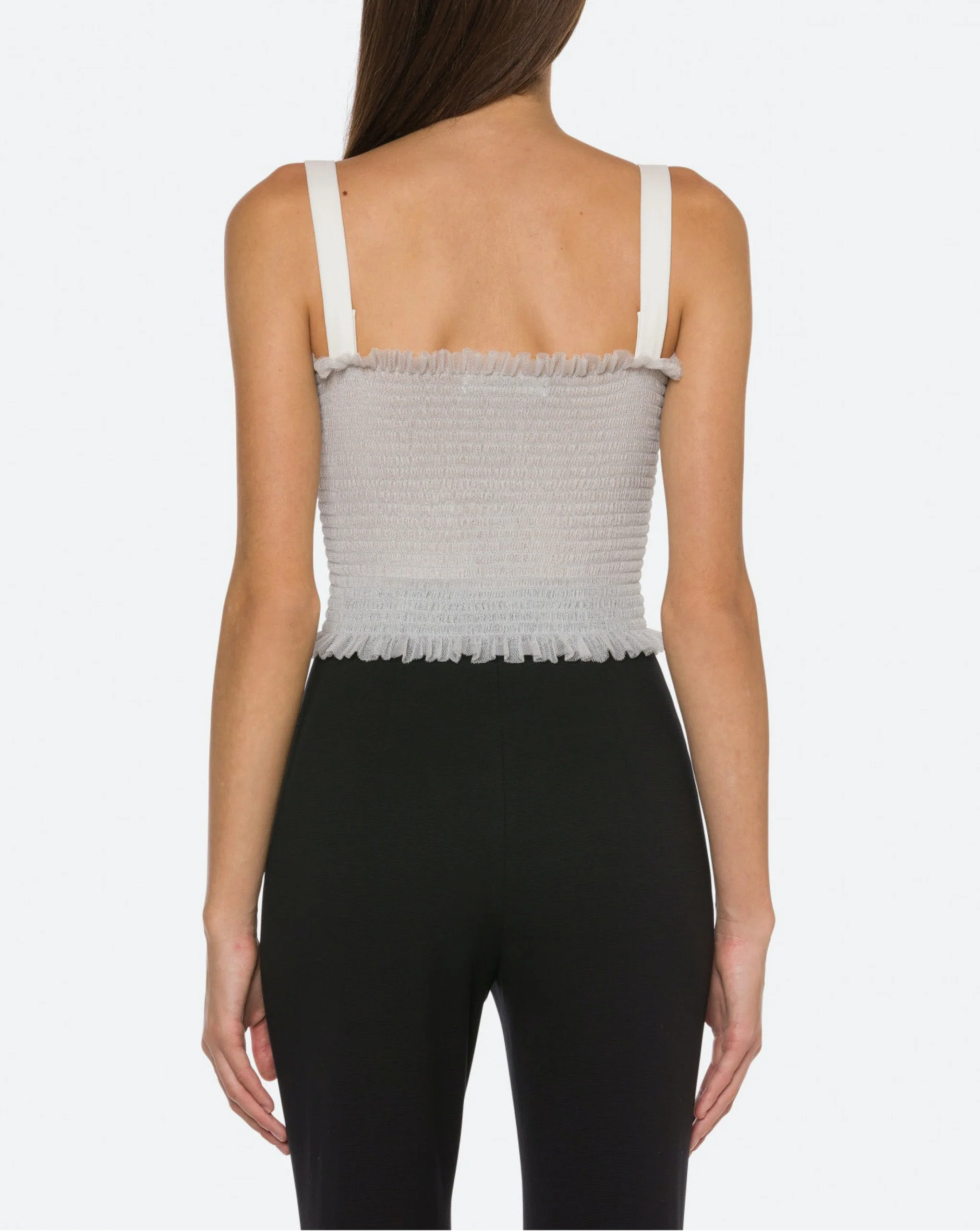 Crop top in tulle decorated with romantic ruffles. The smocking gives elasticity to the fabric and outlines a very feminine slim silhouette.