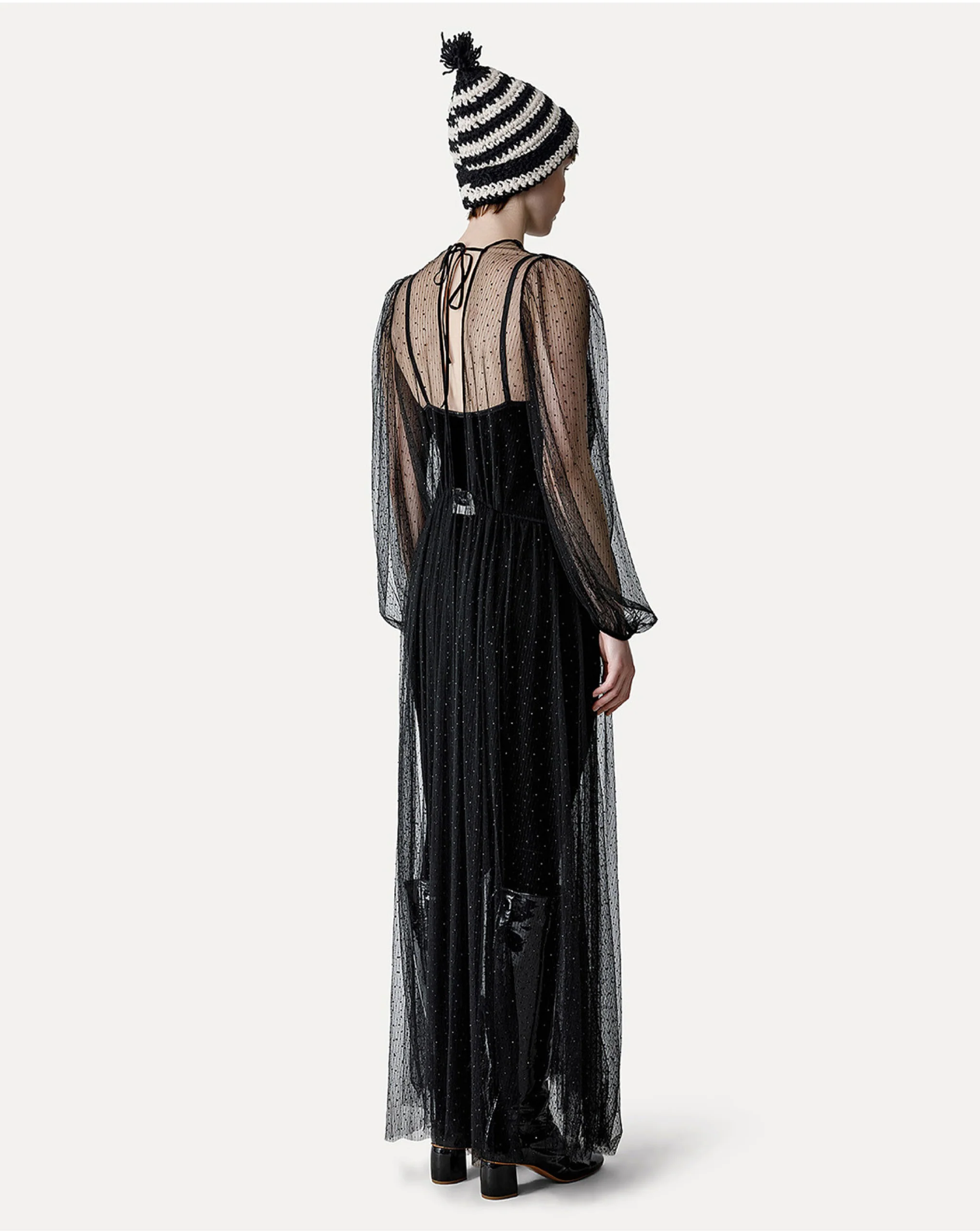 Tulle long dress embellished with all–over diamanté detailing. Completed with a velvet trim on the cuffs as well as edging around the neckline. Comes with a tonal slip dress.Â