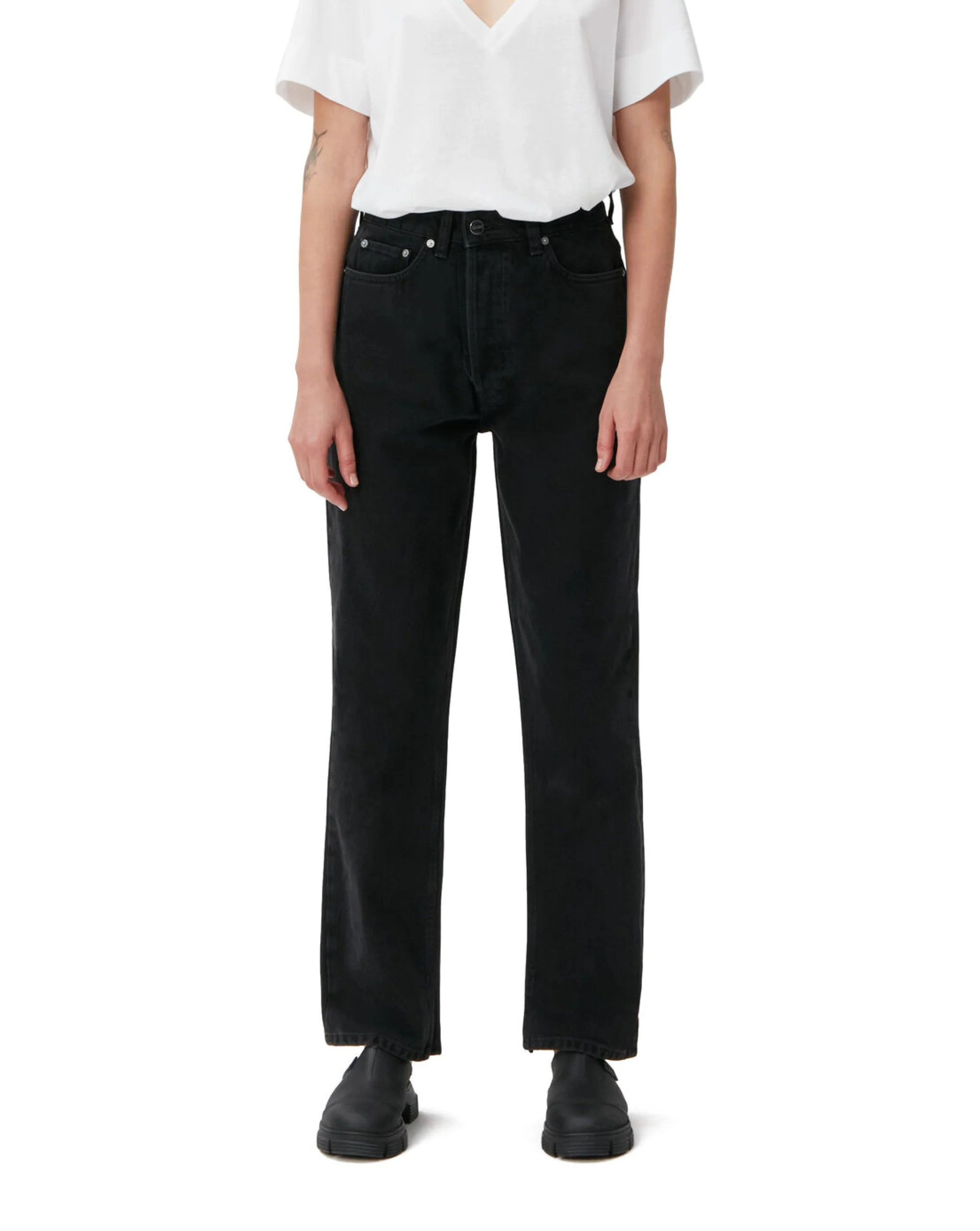 Jeans in non-stretch black denim designed for a relaxed fit throughout and feature a dual button closure. Style low-rise or use the dual button closure to style higher on the waist.
